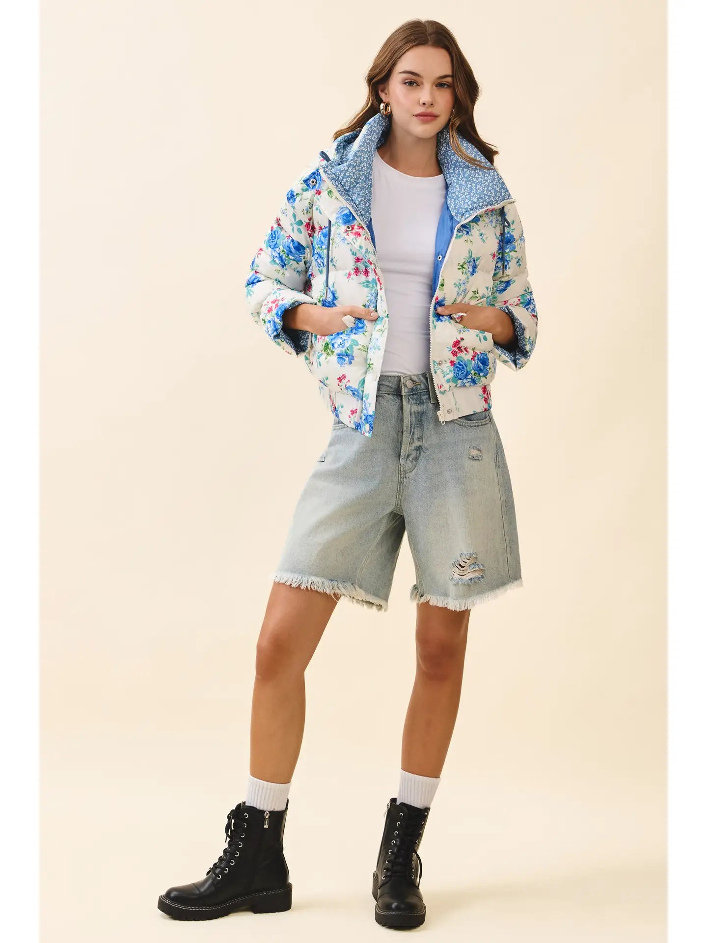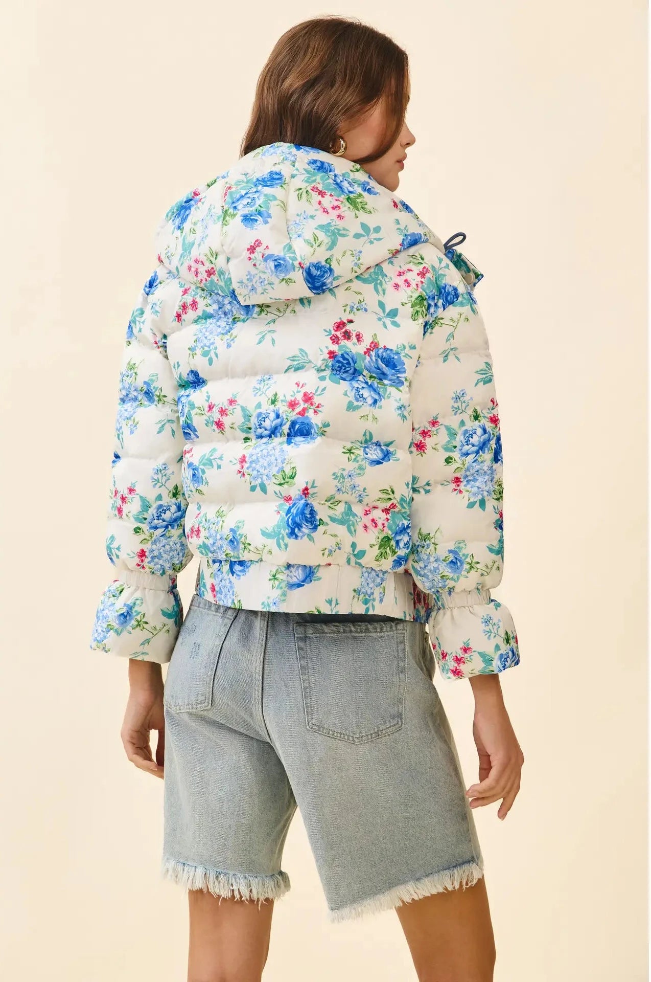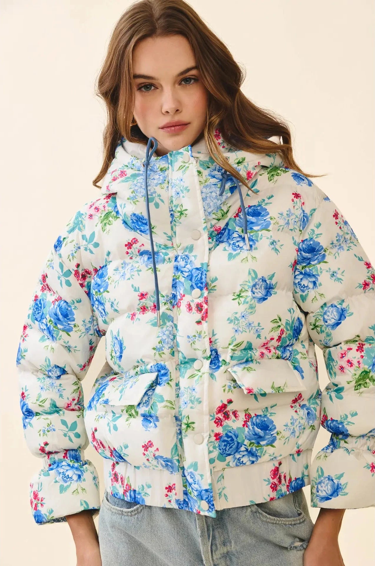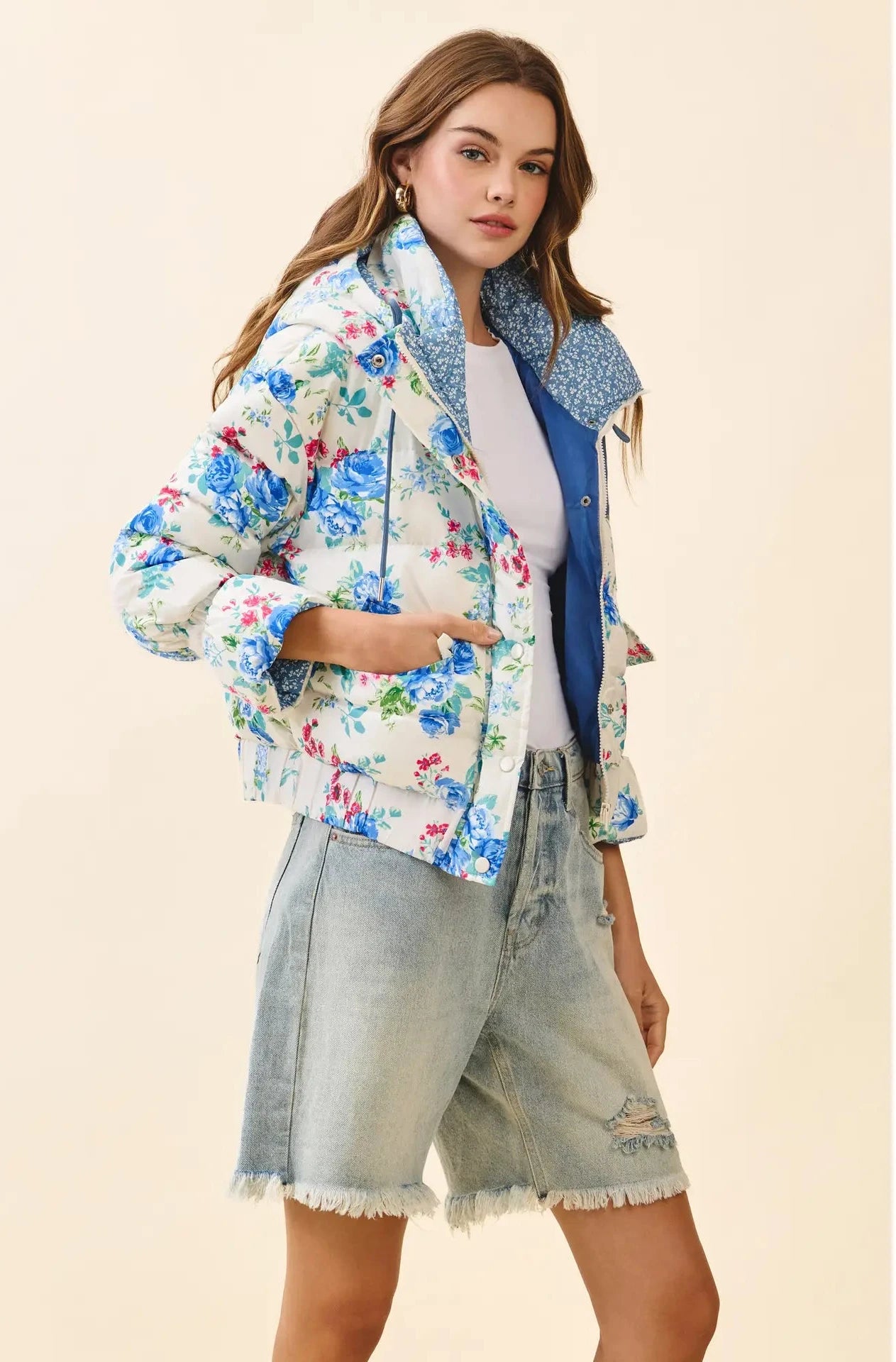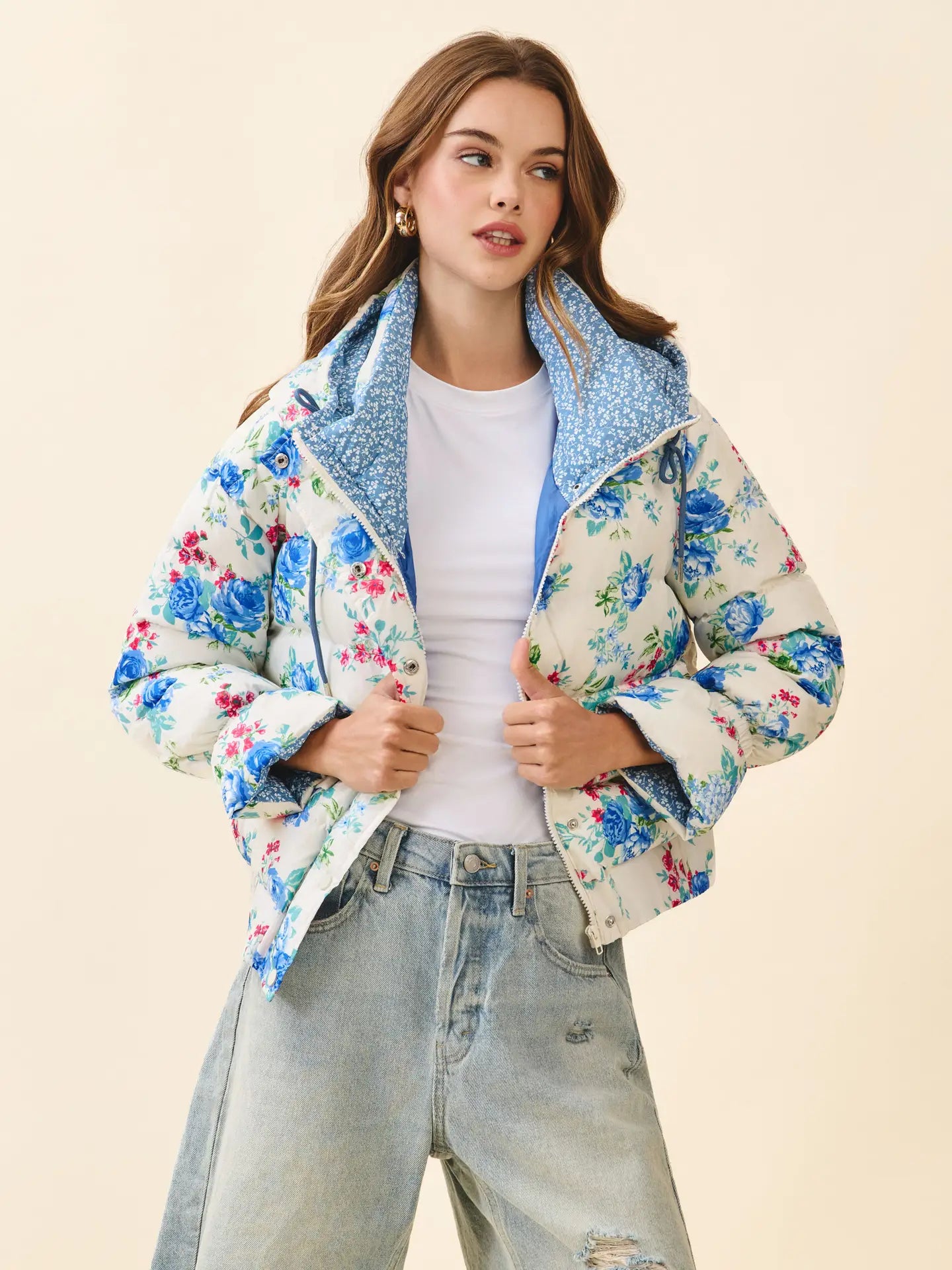 Bright and cozy, the Blue Meadow Puffer combines warmth with a soft floral design. With its hooded, lined interior and comfortable fit, it’s the perfect statement layer for chilly days.